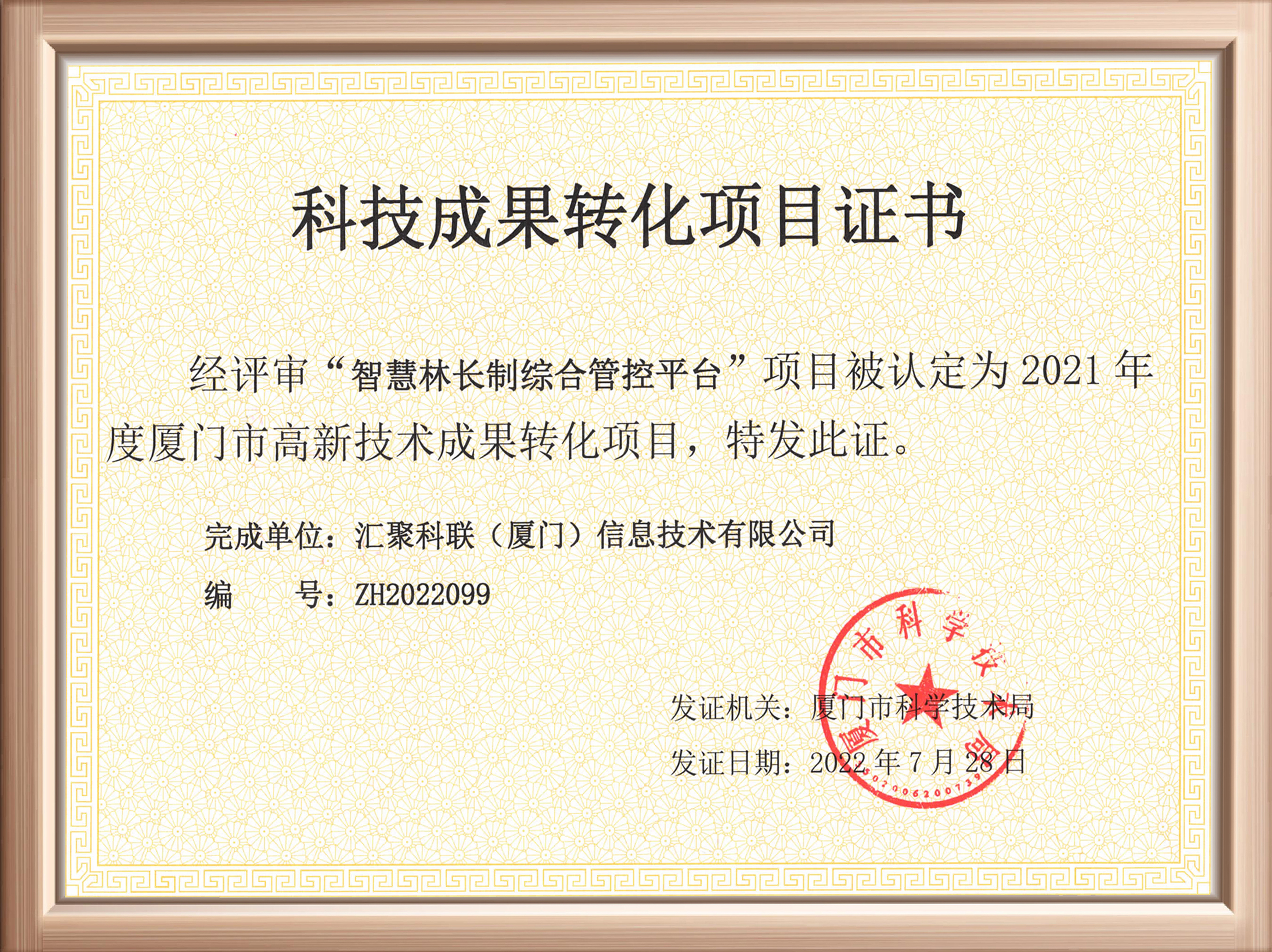 近日,匯聚科聯(lián)收到廈門(mén)市科技局頒發(fā)的“科技成果轉(zhuǎn)化項(xiàng)目證書(shū)”,公司“智慧林長(zhǎng)制綜合管控平臺(tái)”經(jīng)過(guò)評(píng)選,成功被認(rèn)定為2021年度廈門(mén)市高新技術(shù)成果轉(zhuǎn)化項(xiàng)目。